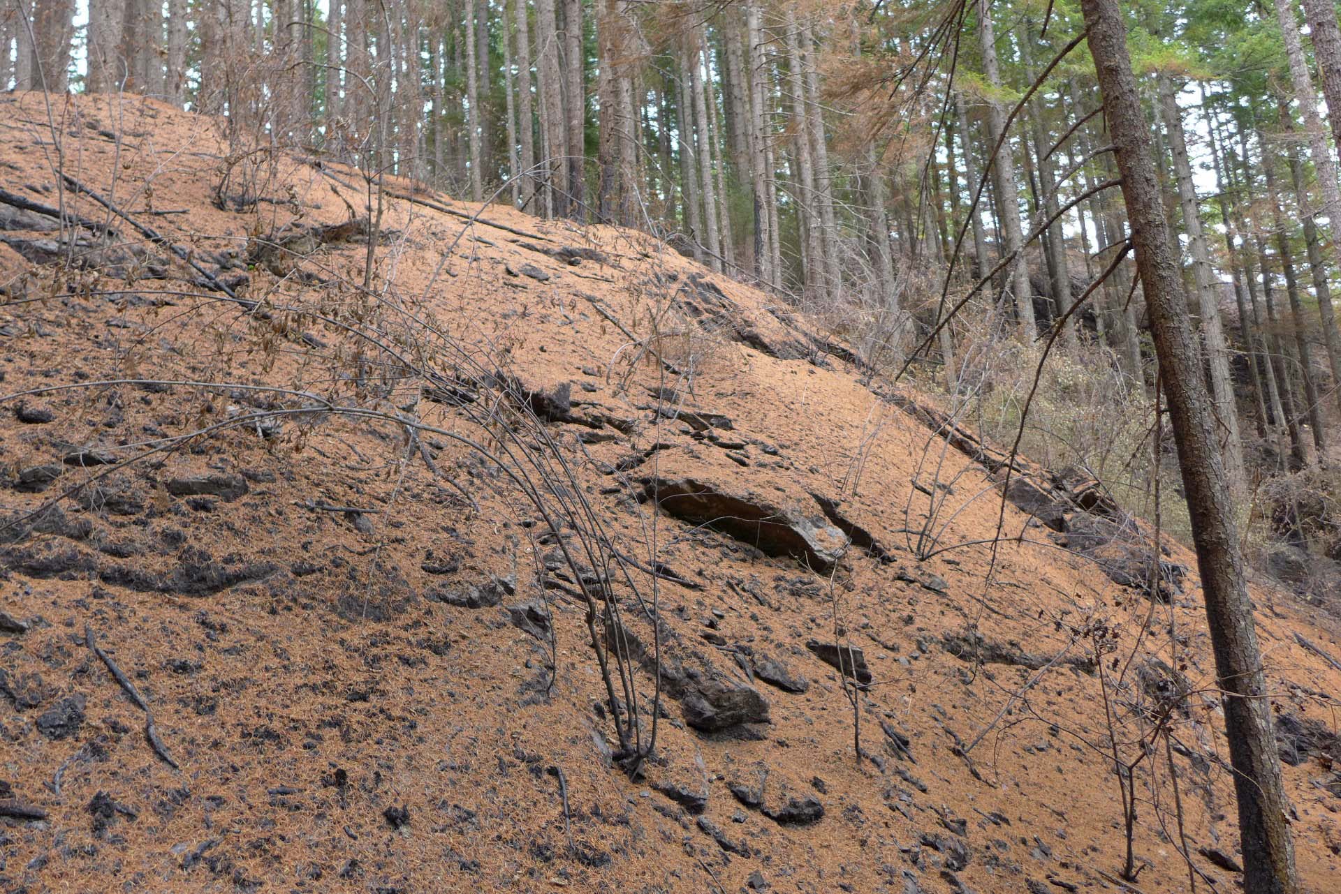 20130826SiBurn06 ← Previous Next → Within the burn area many trees survived, but lost all their needles, resulting in a blanket of orange needles on the ground Taken 2013/08/26. Creative Commons Attribution-NonCommercial-ShareAlike. Attribution: “midforkrocks.com”