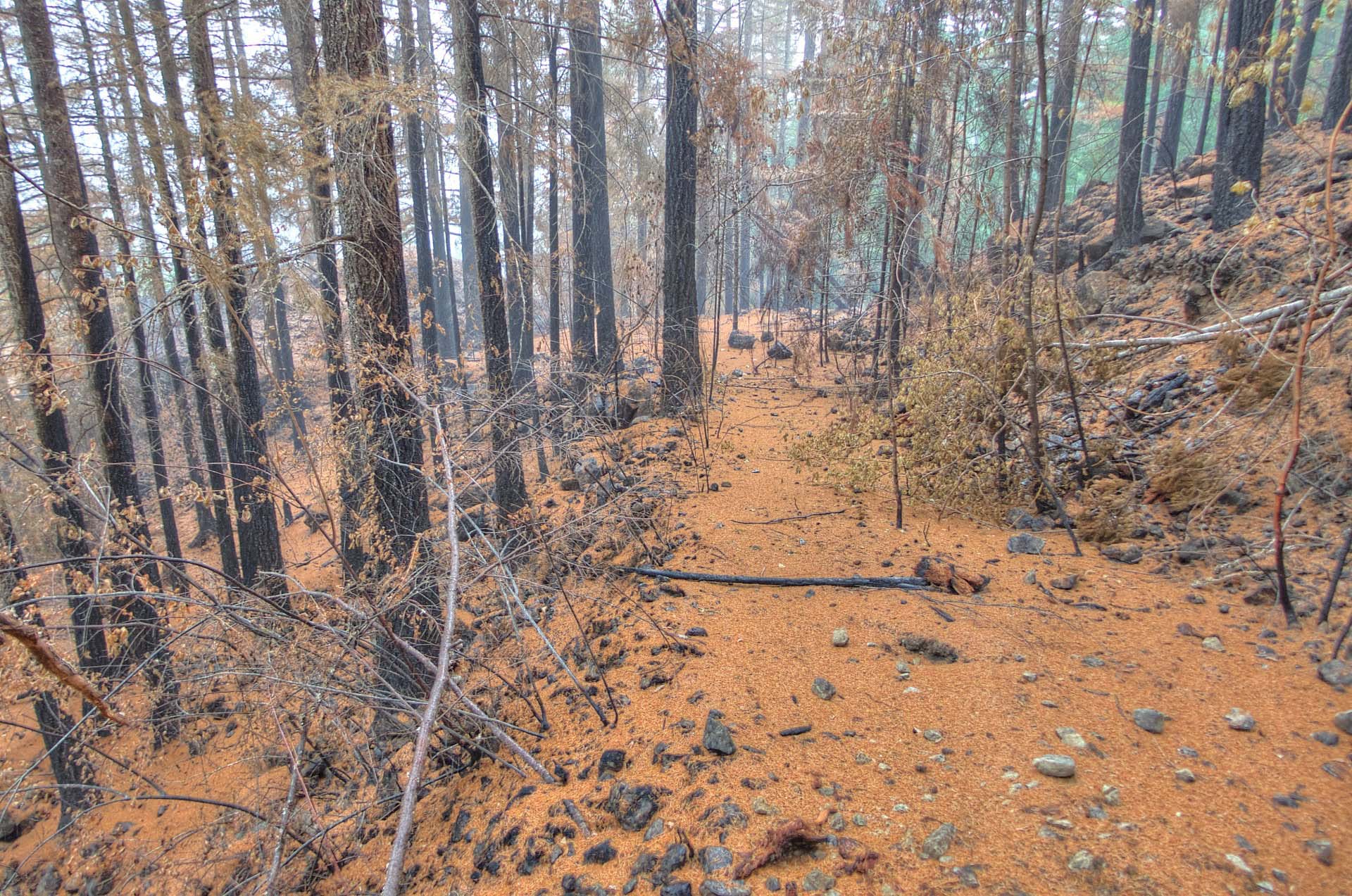 20130826SiBurn09 ← Previous Next → The old logging road leading to BCD vista was carpeted with fallen needles from burnt trees Taken 2013/08/26. Creative Commons Attribution-NonCommercial-ShareAlike. Attribution: “midforkrocks.com”