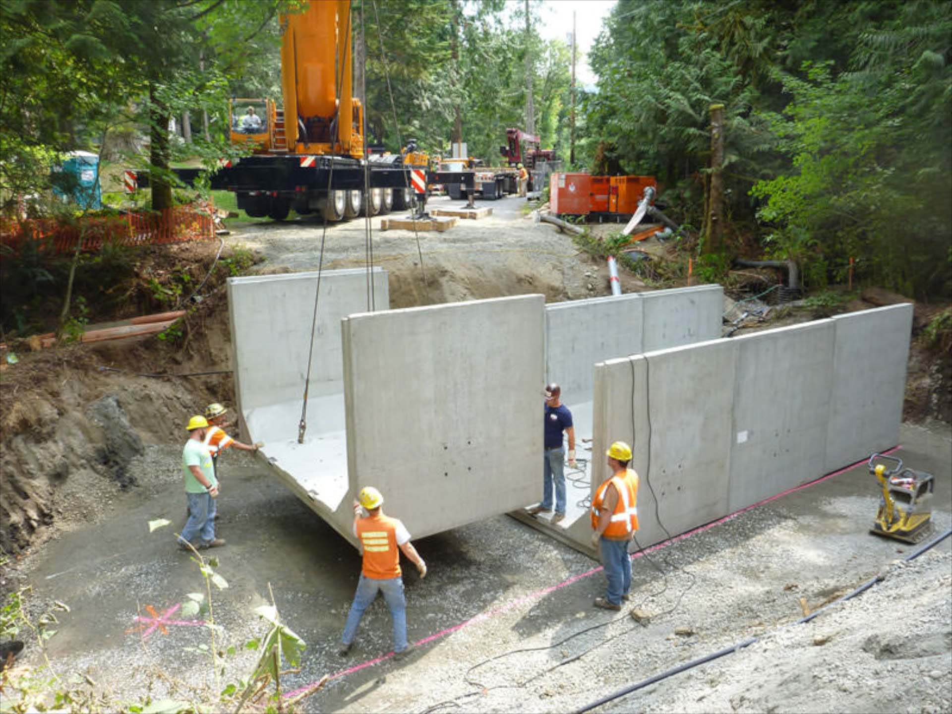 20130828CulvertCompleted02 ← Previous Next → Work crews guide the box culvert sections into place Taken 2013/08/28. Photo courtesy of King County Road Services Southeast Middle Fork Snoqualmie River Road gallery.