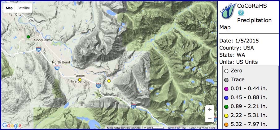 20140105RainMeasurements Next → Precipitation map for Middle Fork area. The North Bend stations would eventually record 4 1/2 inches of rain on the morning of January 5. Creative Commons Attribution-NonCommercial-ShareAlike. Attribution: “midforkrocks.com”