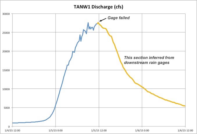 20150105TANW1Gage ← Previous Next → Discharge as measured by the TANW1 river gage. Unfortunately the gage failed midway through the storm so the rest of this graph was inferred as a proportionate estimate from downstream gages measuring the combined flow of all three forks. Creative Commons Attribution-NonCommercial-ShareAlike. Attribution: “midforkrocks.com”